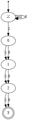 - Если рассмотреть первое из формальных определений выше, строка «1011» принимается, поскольку при её чтении может пройти последовательность состояний , которая удовлетворяет условиям 1-3.
