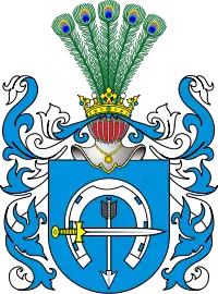 В голубом поле подкова, обращённая шипами к подошве щита; под ней стрела, летящая вниз, а на подкову посередине положен меч рукоятью вправо, острием влево. Нашлемник из павлиньих перьев. Ср.Доленга[1].