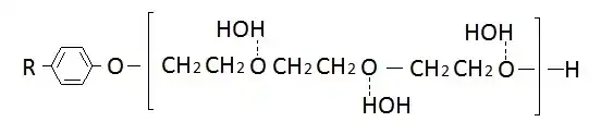 Неионогенные ПАВ не диссоциируют в воде на ионы, однако растворяются в ней. Растворимость в воде обусловлена образованием водородных связей между атомами водорода молекул воды и атомами кислорода полиоксиэтиленовой цепочки: