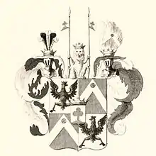 Описание герба: Выдержка из Общего гербовника Щит разделён на четыре части, посередине которых малый щиток, украшенный дворянскою короною, в серебряном коего поле изображён на зеленом холме трилистник; в первой и четвёртой частях в золотом поле находятся одноглавые орлы, имеющие на главах короны; во второй и третьей в красном поле серебряные стропила и на верху оных по одному розану. |