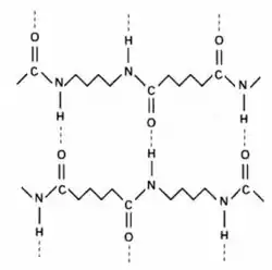 В кристаллических участках макромолекулы нейлонов имеют конформацию плоского зигзага с образованием с соседними молекулами водородных связей между атомами кислорода карбонила и атомами водорода соседних амидных групп. Вследствие этого нейлоны обладают более высокими, по сравнению с полиэфирами и полиалкенами физико-механическими свойствами, более высокой степенью кристалличности (40—60 %) и температурами стеклования и плавления.