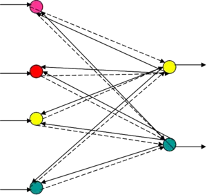 В ДАП конкуренция реализуется взаимным соединением нейронов внутри каждого слоя посредством дополнительных связей. Веса этих связей формируют другую весовую матрицу с положительными значениями элементов главной диагонали и отрицательными значениями остальных элементов.