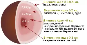 Внешнее ядро состоит из нейтронов с небольшой примесью (несколько процентов) протонов и электронов. У нейтронных звёзд с малой массой внешнее ядро может простираться до центра звезды[10].