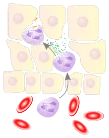 Воспалённые или повреждённые участки соединительной ткани требуют немедленной миграции разнообразных лейкоцитов, в том числе нейтрофилов, в очаг повреждения для удаления патогенных микроорганизмов и восстановления ткани. Наиболее хорошо процесс миграции в ткани изучен для нейтрофилов, которые прибывают в очаг воспаления первыми, существенно быстрее моноцитов, и способны развивать защитные метаболические реакции (в частности, «окислительный взрыв», сопровождающийся продукцией активных форм кислорода) в течение секунд. Активация нейтрофилов сопровождается в первую очередь высвобождением содержимого секреторных гранул. При развитии локального воспаления макрофаги, активированные бактериями или повреждениями ткани, выделяют провоспалительные цитокины, такие как IL-1 или фактор некроза опухоли α (TNF-α). Также к факторам хемотаксиса нейтрофилов относят компоненты комплемента, вещества, выделяемые тучными клетками, иммунные комплексы, эндотоксины и бактериальные пептиды, а также наполненные лизосомы, выходящие в ткань при распаде погибших нейтрофилов и макрофагов[33]. Под действием провоспалительных цитокинов в эндотелиальных клетках, выстилающих ближайшие к очагу воспаления посткапиллярные венулы, увеличивается количество селектинов на поверхности, обращённой в просвет сосуда. Нейтрофилы, циркулирующие в посткапиллярных венулах и имеющие подходящий набор поверхностных гликопротеинов, связываются с селектинами на поверхности эндотелиальных клеток. На данном этапе связывание с эндотелием непрочное, и нейтрофилы продолжают «катиться» по поверхности эндотелия. Провоспалительные цитокины запускают экспрессию интегринов в катящихся нейтрофилах и лигандов интегринов, известных как ICAM-1, на поверхностях эндотелиальных клеток. В то же время межклеточные контакты между клетками эндотелия ослабляются, и эндотелий становится более проницаемым. За счёт интегринов нейтрофилы прочно связываются с эндотелием и прекращают качение, и в конечном счёте приступают к прохождению через эндотелий с помощью псевдоподий (этот процесс известен как диапедез). Проникновение нейтрофилов через эндотелий облегчается благодаря длинному и сегментированному ядру. Прохождение нейтрофилов через эндотелий и дальнейшая миграция к очагу воспаления стимулируются хемокинами[34]. Базальные мембраны нейтрофилы преодолевают благодаря выделению содержимого желатиназных гранул[35].
