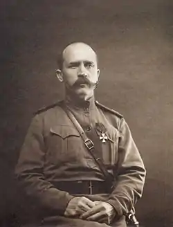 За то, что 21 февраля 1915 г. в бою у д. Кузи, командуя 1-й ротой, стремительным натиском атаковал противника и сбил его с занимаемой позиции, причём захватил пулемет и, будучи при этом ранен, сдал командование заместителю лишь после того, когда убедился, что пулемет был вынесен из боя.