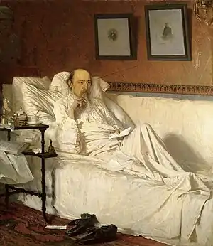 В начале 1875 года Некрасов тяжело заболел. Врачи обнаружили у него рак кишечника — неизлечимую болезнь, которая на два последующих года приковала его к постели[6]. На это время его жизнь превратилась в медленную агонию. Некрасова оперировал специально прибывший из Вены хирург Бильрот, однако операция лишь ненамного продлила ему жизнь.