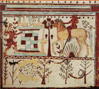 Роспись имеется только на стенах центрального зала и представляет собой сюжетные композиции. Простенок между дверями заполнен изображению сюжета из Илиады — вооруженный Ахилл пытается из-за укрытия напасть на Троила. Верхняя часть колодца, за которым прячется Ахилл, украшена скульптурами животных, все остальное свободное пространство заполнено растениями. Характер этой росписи типичен для этрусского искусства — размеры всадника и лошади непропорциональны, а контурные линии всех элементов изображения выписаны достаточно резко.[3]