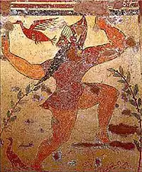 На боковых стенах изображения более динамичны. На левой стене бородатый этруск в коротком хитоне танцует возле деревьев, рядом с танцором летают птицы. На правой стене нарисована борьба двух атлетов — молодого и пожилого.[3]