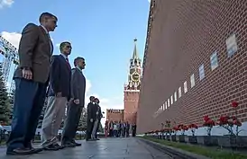 ![]() Астронавт МКС-49 Шейн Кимбро (слева), российские космонавты Сергей Рыжиков (в центре) и Андрей Борисенко и члены дублирующего экипажа возлагают гвоздики к месту погребения Юрия Гагарина, Сергея Королёва и погибших во время полётов космонавтов Комарова, Добровольского, Волкова и Пацаева в рамках традиционной церемонии перед стартом, четверг, 1 сентября 2016 г. в Москве. Фото: (НАСА / Билл Ингаллс) | |