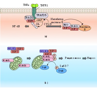 Когда каспазная активность заблокирована, CYLD деубиквитинирует RIPK1 в некросоме, что увеличивает её киназную активность. Фосфорилирование человеческой RIPK3 по положению Ser227 или мышиной RIPK3 по Ser232 необходимо для привлечения псевдокиназы MLKL (англ. mixed lineage kinase domain-like). MLKL далее фосфорилируется по Thr357 и Ser358 человеческой RIPK3 или по Ser345, Ser347, Ser352 и Thr349 мышиной RIPK3 и участвует в последующих событиях некроптоза[4].