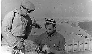 Главный инженер головного сооружения Большого Ферганского канала профессор Ф. Нельсон-Скорняков за беседой с уполномоченным колхозником на одном из участков строительства (1939).