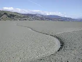 ![]() Водные каналы на илистых отмелях Нельсон-Хейвен во время отлива, Нельсон виден вдали. | |