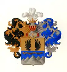 Щит пересечён. В первой, золотой части, два чёрных противопоставленных орлиных крыла. Во второй, лазоревой части, серебряная о пяти острых вершинах гора, сопровождаемая в главе, золотым жезлом обвитым серебряною змеёю, в пояс.