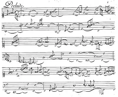 Прелюдия может быть одночастной, целиком с ненотированным ритмом (как например, прелюдия из сюиты G-dur д’Англебера, см. нотный пример), либо многочастной, где разделы с фиксированным ритмом сочетаются с разделами с нефиксированным ритмом. Пример второго рода — трёхчастная «Прелюдия в подражание Фробергеру» (фр. Prélude а l'imitaion de Mr. Froberger) a-moll Л.Куперена, в которой первый и третий разделы формы неметрические, а второй — небольшая метризованная фуга (ритм и тактовый размер выписаны). Клавесинные сюиты, плачи (итал. lamenti) и томбо́ (фр. tombeaux, музыкальные эпитафии) самого Фробергера метризованы (есть тактовый размер и тактовые черты), но предполагают, тем не менее, «рапсодическую» (квази-импровизационную) ритмизацию на манер французских лютневых прелюдий.