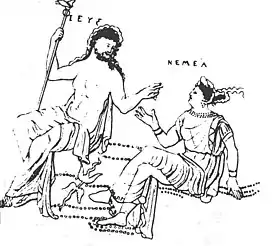 ![]() Немея беседует с Зевсом. Часть изображения Археморовой вазы «Смерть Архемора» | |