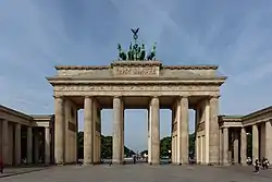 В правление Фридриха Вильгельма II нововведений в системе репрезентативной архитектуры почти не было, за исключением строительства Бранденбургских ворот, спроектированных Карлом Готтгардом Ланггансом. Выстроенные на окраине Берлина, они выполняли функцию таможенного поста и демонстрировали мирные намерения — первоначально ворота венчала квадрига с богиней мира Эйреной. Ворота были построены в греческом стиле, вдохновлённом афинскими пропилеями, что можно рассматривать как продолжение концепции «Афин на Шпрее». С 1790-х годов Пруссия погрузилась в череду войн с Францией и значение ворот сменилось на противоположное: квадригу с богиней мира заменили на богиню победы Викторию работы Иоганна Готфрида Шадова, что должно было символизировать победу над французскими войсками[27][28].