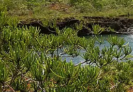 Вечнозелёное хвойное дерево 2—10 м в высоту с восходящими ветвями. Кора более или менее гладкая с длинными бороздами, разделяющаяся на тонкие волокнистые полосы, коричневая, с возрастом сереющая. Листья на взрослых растениях ланцетные, заострённые, с выраженным килем на дорсальной стороне и вогнутые сверху, 4,5×2 мм, расположены в восемь рядов чередующимися мутовками по четыре. Внешний вид растений напоминает некоторые виды араукарии, несмотря на то, что эти растения весьма отдалённо родственны друг другу.