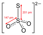 Тиосульфат-ион по строению близок к сульфат-иону. В тетраэдре [SO3S]2− связь S−S (1,97 Å) длиннее, чем связи S−O (1,48 Å).