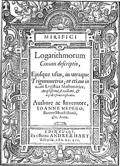 В 1614 году Непер опубликовал в Эдинбурге сочинение под названием «Описание удивительной таблицы логарифмов» (лат. Mirifici Logarithmorum Canonis Decriptio, 56 страниц текста и 90 страниц таблиц). Там было краткое описание логарифмов и их свойств, а также семизначные таблицы логарифмов синусов, косинусов и тангенсов для углов от 0° до 90°, с шагом 1′. Немного позже и независимо от Непера таблицу логарифмов опубликовал швейцарский математик Йост Бюрги, однако таблицы Непера были практичнее и удобнее в пользовании[13].