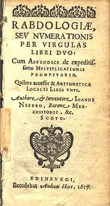 - (1617) Рабдология (Rabdologiæ seu Numerationis per Virgulas libri duo Архивная копия от 3 августа 2020 на Wayback Machine). Этот и следующий труд изданы посмертно сыном Непера, Робертом. В «Рабдологии» описаны несколько изобретений, облегчающих вычисления, в том числе палочки Непера.