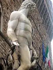 Беломраморная скульптура Нептуна широко известна во Флоренции. Огромный размер, странные пропорции статуи, разномасштабность фигуры морского бога, тритонов и нимф дали флорентийцам повод именовать скульптуру иронично, но всё-же любовно: «Бьянконе» (итал. Il Biancone — Белый великан)[1]. Гипертрофированные пропорции: огромная голова, широкие плечи, как и фигуры трубящих в раковины тритонов, буквально «застрявших» между ног «Белого великана», демонстрируют характерные особенности маньеристической скульптуры и архитектуры второй половины XVI века во Флоренции — «тенденцию смешения масштабов, несоразмерности и даже несуразности отношений величин». Это особенно заметно при сравнении «Бьянконе» с находящимся неподалёку, здесь же, на Пьяцца Синьория Давидом Микеланджело: две эпохи (Высокое Возрождение и маньеризм), два стиля и два по-своему выдающихся художника[2].