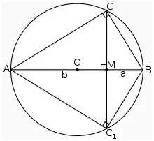 Количество доказательств этого неравенства на данный момент сравнимо, наверное, только с количеством доказательств теоремы Пифагора. Приведем красивое геометрическое доказательство для случая . Пускай нам даны два отрезка длины и . Тогда построим окружность диаметром (см. рис. 1). От одного из концов диаметра отметим точку на расстоянии . Проведем через эту точку перпендикуляр к диаметру; полученная прямая пересечет окружность в двух точках, и . Рассмотрим полученную хорду. Треугольник прямоугольный, так как угол — вписанный в окружность и опирающийся на её диаметр, а значит, прямой. Итак, — высота треугольника , а высота в прямоугольном треугольнике есть среднее геометрическое двух сегментов гипотенузы. Значит, . Аналогично, из треугольника получаем, что , поэтому . Так как — хорда окружности с диаметром , а хорда не превосходит диаметра, то получаем, что , или же . Заметим, что равенство будет тогда, когда хорда будет совпадать с диаметром, то есть при .