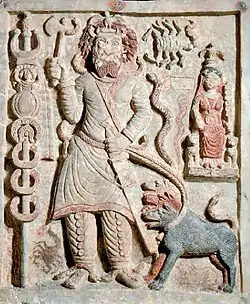 Нергал часто сравнивается или воплощает образ льва: «с поднятыми лапами, гневно неистовствующий, тот, что точит зубы против своего врага»[18]. В русле этой иконографической традиции выполнено изображение присевшего льва, посвященное «могучему льву», Нергалу Апиакскому[18]. Известно украшение в виде двух львов на рукояти меча, посвященного богу города Хубшалум (Нергалу), а также близкое по символике изображение «Бога-меча» из Язылыкая[18] (на иллюстрации).