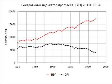 К другой категории показателей относятся количественные индикаторы, в том числе представляющие собой усложненные версии ВВП. Наиболее известным из них является индикатор подлинного прогресса (GPI). В его основе лежит принцип деления составляющих ВВП на выгоды и издержки, итоговый показатель является разностью их величин. Кроме статей ВВП, в GPI включают выгоды и негативные последствия (издержки) экономической деятельности, которые не являются предметом купли-продажи на рынке и не имеют рыночной цены. Для определения их величин используется экспертные оценки. Набор критериев, определяющих общественное благосостояние, продолжает оставаться предметом дискуссий, поэтому GPI критикуют за субъективность выбора включаемых в него факторов, особенно в части издержек. Тем не менее, есть примеры применения этого индикатора в управлении экономикой[6][7], сторонники GPI оценивают его как более надежную меру экономического прогресса, чем ВВП.[8]