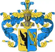 Щит разделён перпендикулярно на две части, имеет золотое и голубое поля, в коих изображены два до половины вылетающих орла, держащие в лапе по одному длинному кресту, в золотом поле чёрный, а в голубом поле золотой. Щит увенчан обыкновенным дворянским шлемом с дворянскою на нём короною и тремя страусовыми перьями. Намёт на щите голубой, подложен золотом.