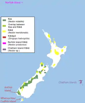 48 см длиной. В окрасе преобладают оливково-зелёные тона. Перья с тёмными концами. Клюв и ноги тёмно-коричневого цвета. Клюв самца длиннее клюва самки. | Новая Зеландия: Южный остров Высокогорные леса 850—1400 м над уровнем моря. |