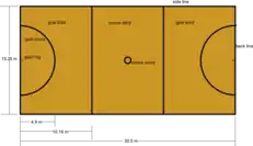 Площадка для игры размером 15,25 м на 30,5 м (50 на 100 футов) разделена на три отдельные зоны (или «трети»). По обеим сторонам площадки находятся полукруглые зоны — площади ворот («shooting circles») радиусом 4,9 м (16 футов).