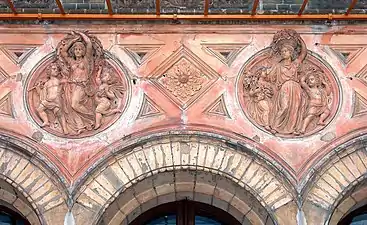 Восточный и западный фасады украшают различные элементами, изготовленные из терракота. Капители колонн и другие фигурные изображения были изготовлены на берлинском печном заводе Тобиаса Файльнера.