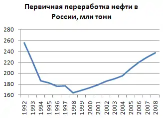 За период экономических реформ 1990-х годов в нефтепереработке и нефтехимических отраслях произошло значительное сокращение объёма производства[4]. Из-за резкого сокращения внутреннего потребления нефти при суммарных мощностях по первичной её переработке 296 млн тонн в год в 2000 году фактически было переработано 168,7 млн тонн, то есть загрузка нефтеперерабатывающих заводов упала до 49,8 %[4].