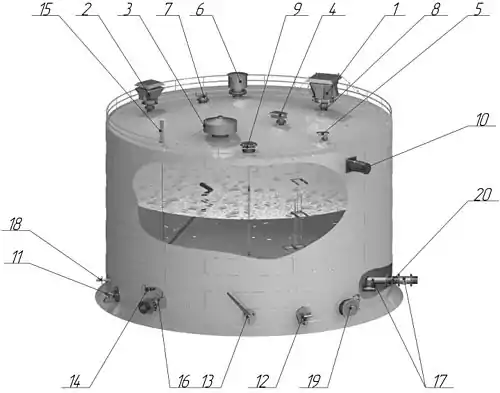 - для проведения очистных операций: винтовые мешалки с электроприводом, стационарная разводка труб с размывающими соплами, придонный очистной люк в стенке, патрубок зачистной, зумпфы;