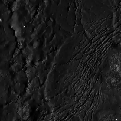 Террасовидная структура в западной части внутреннего склона кратера. Снимок Lunar Reconnaissance Orbiter. Ширина снимка около 660 м
