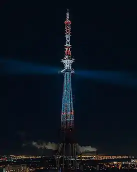 Изначально многоуровневая подсветка размещалась на трёх уровнях — 4-8 м, 140 м и 148 м. К 2015 году реконструированная система освещения башни состояла из 28 прожекторов с газоразрядными лампами белого и жёлтого цвета, установленных на 13 ярусах: первый «световой контур» находился на высоте 8-ми метров, а последний — на 180-метровой высоте.[14]