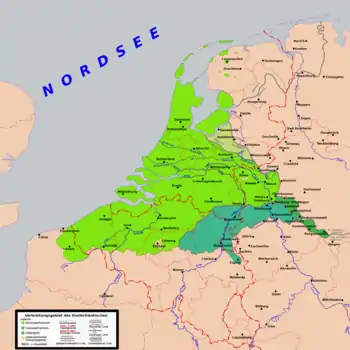 Точные границы нижнефранкского сложно определить, так как на предположительных границах наблюдается его смешение с соседними языками и диалектами. Признанным является то, что область распространения нижнефранкского севернее линии Бенрата и западнее вестфальской изоглоссы (также известна как Einheitsplurallinie, отделяющая нижнесаксонские диалекты от франкских). На юго-западе нижнефранкский ограничен французским языком, ближе к побережью наблюдается усиление фризского языка. С позиций территориальных большая площадь распространения приходится на Нидерланды и север Бельгии.