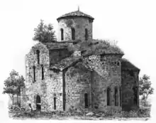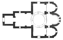 Храм представляет собой трёхапсидную крестово-купольную постройку, сложенную из обтёсанных блоков и плит на известковом растворе. Купол здания поддерживался двумя парами четырёхугольных столбов, делящих пространство храма на три продольных нефа. Средний неф шире боковых, соответственно центральная апсида шире и заметно выдвинута вперёд по сравнению с боковыми. С трёх сторон (кроме восточной), к храму примыкают притворы, перекрытые каменными сводами. Вместе с притворами здание имеет размеры 25,5 х 19,5 метров. Отдельно исследователями отмечается, что без притворов размеры храма строго пропорциональны — 21 х 10,5 метров, то есть ширина его равна половине длины, что соответствует требованиям римской и греческой архитектуры. Дополнительно пропорциональность постройки поддерживается тем, что ширина подкупольного квадрата равна ширине западной и восточной сторон креста, ширина нартекса — длине и ширине притворов, а толщина стен — толщине пилонов[22][24].