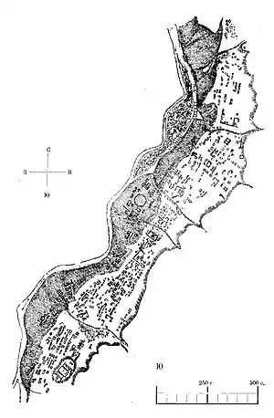 - Город. Территория собственно древнего города начинается от балки Хасана и расположенного на её краю Среднего храма. Его постройки расположены вдоль трёх хорошо прослеживаемых узких улиц, шириной около 3 метров и не имеющих признаков благоустройства: вымосток, водостоков и тому подобного, которым археологи дали условные имена. Улица «Центральная» — довольно прямая, начинающаяся от балки Подорваной и проходящая через всё поселение спускается к реке и расположенному на её берегу Каменному кольцу. Улица «Подгорная» недалеко от балки Подорваной ответвляется от «Центральной» и через 220 метров, образуя петлю, направляется далее на северо-восток вдоль подошвы хребта Ужум. Улица «Набережная» тянется вдоль обрыва к реке на протяжении свыше 500 метров в итоге сливаясь улицей «Центральной». Внутри городища находится хорошо сохранившийся Южный храм, руины трёх «малых» одноапсидных церквей, жилых и производственных построек, остатки христианских кладбищ.