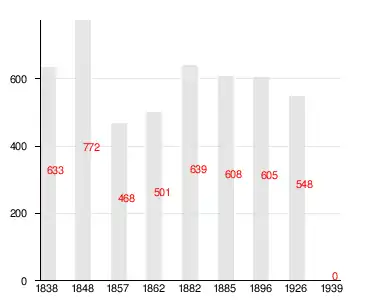 Согласно административным данным на 1 января того же года «в деревне населения нет»[28]. По переписи населения 1939 года, такого населённого пункта уже не существует[29], хотя на картах того времени он ещё обозначается с точностью до дома и насчитывает 123 двора[30].