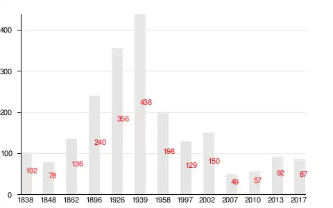 | 1939 | 1958 | 1997 | 2002 | 2007[28] | 2010[29] | 2013[30] |