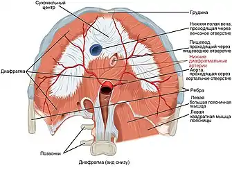 Нижние диафрагмальные артерии - это два небольших сосуда, снабжающих кровью нижнюю поверхность диафрагмы, пищевод, грудную стенку, и надпочечники.[2][3]