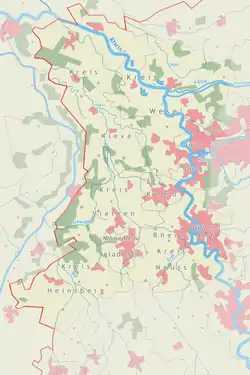 К Нижнему Нижнему Рейну относятся города и районы: Альпен, Бедбург-Хау, Вахтендонк, Везель, Веце, Гельдерн, Гох, Динслакен, Дуйсбург, Иссум, Калькар, Керкен, Кевелар, Клеве, Краненбург, Ксантен, Мёрс, Райнберг, Рес, Рёрт, Удем, Фёрде, Хамминкельн, Хюнксе, Штрален и Эммерих.