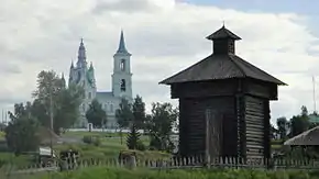 Сторожевая башня на фоне Спасо-Преображенской церкви