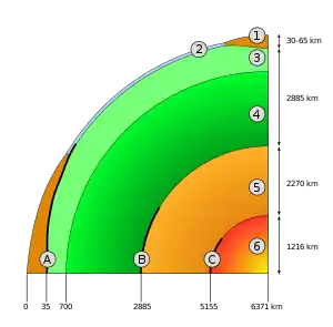 Под нижней мантией находится граница Гуттенберга — граница между мантией и внешним ядром, характеризующаяся скачкообразным падением скорости продольных волн с 13,6 до 8,1 км/с и исчезновением поперечных волн.