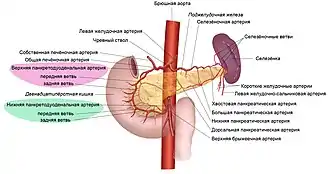 | Делится на | Нижняя передняя поджелудочно-двенадцатиперстная артерия, Нижняя задняя поджелудочно-двенадцатиперстная артерия |