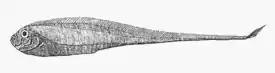 Тело длинное, сильно сжато с боков, лентообразное; без чешуи, покрыто бугорками и порами. В передней части тело относительно высокое, его высота составляет 12—16 % стандартной длины тела. Высота тела постепенно снижается, и в задней части тело имеет вид длинного тонкого хвоста; нет резкого утончения тела на уровне анального отверстия. Глаза большие, их диаметр составляет 9—10 % длины тела от кончика рыла до анального отверстия. Рот маленький, сильно выдвижной; косой, направлен вверх. На верхней челюсти 9—21 зубов, на нижней челюсти 6—9 зубов. Есть зубы на сошнике и нёбе. На верхней части жаберной дуги 2—3 жаберные тычинки, на нижней части — 7—9 жаберных тычинок. Длинный спинной плавник с 142—147 мягкими лучами тянется от верхушки рыла до хвостового стебля. Первые лучи плавника сильно удлинённые у молоди, у взрослых особей укорачиваются. В грудных плавниках 11—12 мягких лучей. Брюшные плавники с 7-ю лучами; есть и у молоди, и у взрослых особей (редуцированные). У молоди лучи брюшных плавников сильно удлинённые. Анальный плавник отсутствует. Хвостовой плавник асимметричный, верхняя лопасть с 12 удлинёнными лучами, а нижняя — с пятью редуцированными лучами. Боковая линия состоит из 127—130 колючих пластинок, в хвостовой части тела проходит волнообразно. Позвонков 84—87[2].