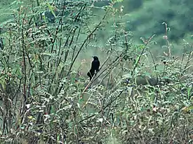 Птица средних размеров с длинным хвостом и относительно длинными клювом и ногами. Последние чёрного цвета, глаза же бледно-жёлтые. Длина самцов около 31 см, самок 25 см. Оперение самцов полностью чёрное, глянцевое. Самки коричневые с бледными «бровями» (суперциллумом).