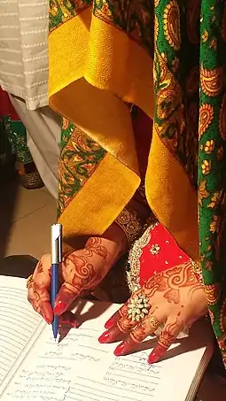 Согласие на брак со стороны законного опекуна (вали) обязательно, если девушка раньше не была замужем и является девственницей, согласно хадисам: «Брак женщины, которая вышла замуж без разрешения её опекуна, недействителен»[10], а также: «Брак не должен происходить без опекуна»[10]. Либо, если женщина уже взрослая или разведена, тогда, согласно хадису, «Бывшая ранее замужем женщина должна иметь право решить сама за себя, тогда как у девственницы нужно спросить согласия на замужество, и знак её согласия — молчание»[11][12].