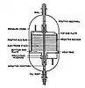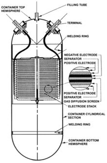 Положительный электрод изготавливают из спечённого[17] пористого никелевого диска, который содержит гидроксид никеля. В отрицательном водородном электроде используют связанный тефлоном платиновый катализатор с сепаратором из циркониевых нитей[18].[19]